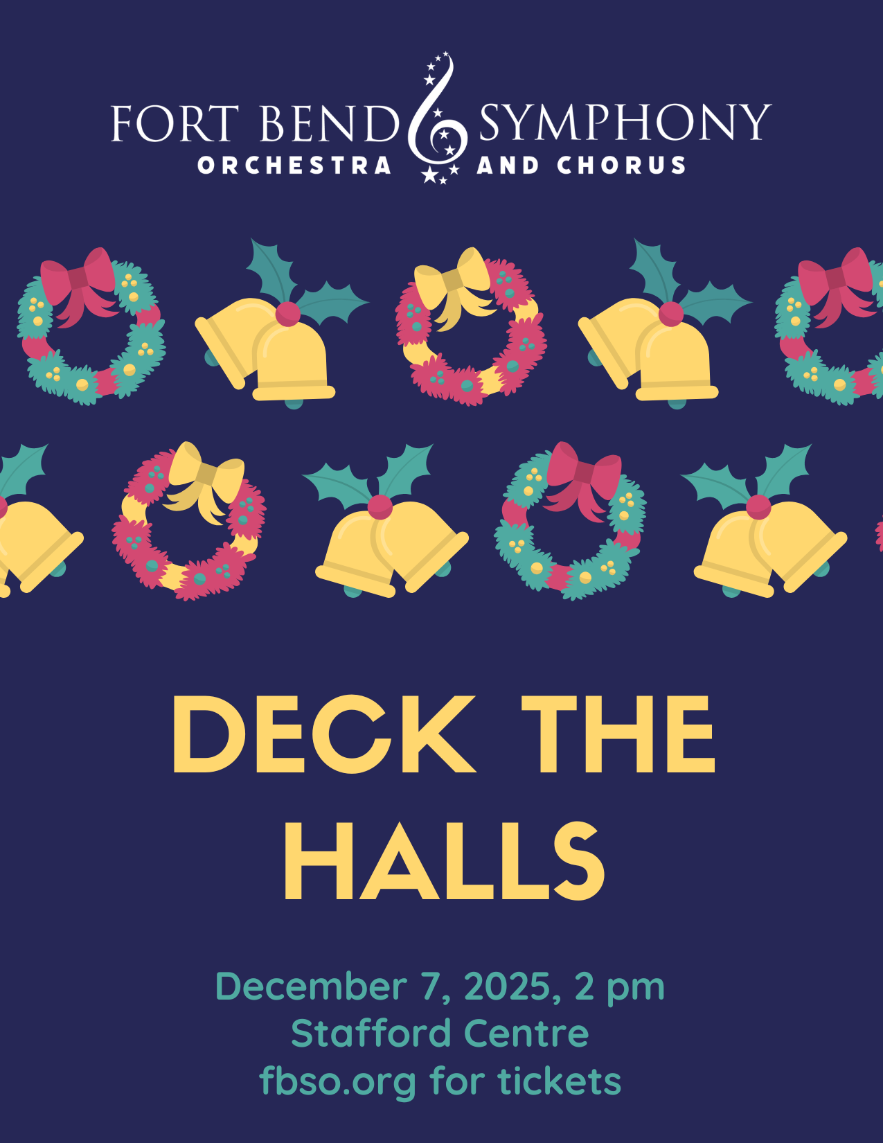 Kick off your festive season with the Fort Bend Symphony Orchestra and Chorus and Deck the Halls! Hear timeless tunes and new favorites. Sing along to carols new and old, shop for those hard-to-buy-for relatives at the Holiday Handmade Market, and be transported into the holiday season! Join the orchestra and chorus for our most anticipated concert of the year on Sunday, December 7th, at 2 pm, at the Stafford Centre.